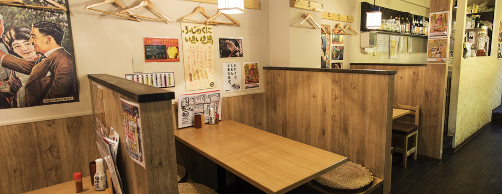 大衆居酒屋ながら女性やお子様連れでもご利用頂きやすい雰囲気で店舗をコンセプトに営業しています。大衆居酒屋ですが、男臭さを感じさせない様に明るい店内の雰囲気をイメージしていきました。立地の特徴でもある家族連れ・子連れでも使いやすいように大衆居酒屋らしさのカウンターもありながらBOX席を用意して地域の特性に合わせた店舗構成にしていきました。物件の課題としては細長い間取りで上手く設計をしていかないと狭々しい感じをお客様に感じさせてしまうので収納を全てベンチ(座席)の下に設置して感じさせない様に工夫しました。また、お店の運営にもひと工夫取り入れデシャップ(厨房とホールの間にある料理を出す場所)からホールの担当者が全フロアが見渡せるようにスペースを確保しお客様の動きと厨房の動きが見渡せるようにしてスムーズに店舗が回る様に出来る工夫もしました。入口も入り易さを意識して外から店内が見渡しやすいような作りにして全開口の入り口に工夫しました。女性が入りやすい、家族連れや子連れでも入りやすいを意識した入口にしました。